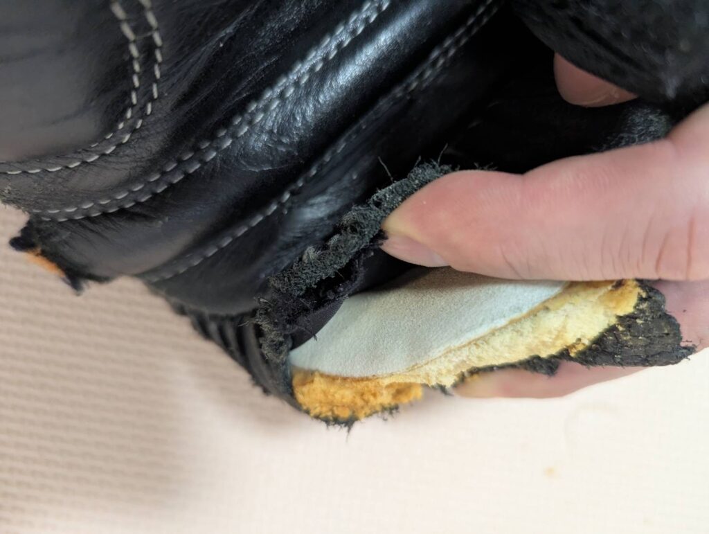 今までレイジェスのグローブはEVAフォームだと思っていたのですが、古いグローブを分解して中身を確かめた結果、こちらのラテックスフォームが使用されていました。